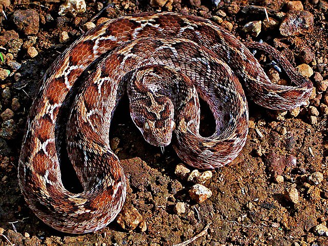 | General Shape Snake with a very short tail that is small in length, cylindrical, and moderately slender in build. Can reach a maximum height of approximately 0.83 meters. When viewed from above, the head is broad, flat, and pear-shaped, and it is distinct from the neck. Short and broad, the snout is. Canthus is a blurry outline. The pupils of the eyes are vertically elliptical in shape and are of medium size. The scales on the head are keeled. Dorsal scales are dull, strongly keeled, and imbricate with apical pits. Dorsal scales are keeled and dull. The serrations on the lower lateral body scales are particularly noticeable. Ventrals have a rounded shape. |